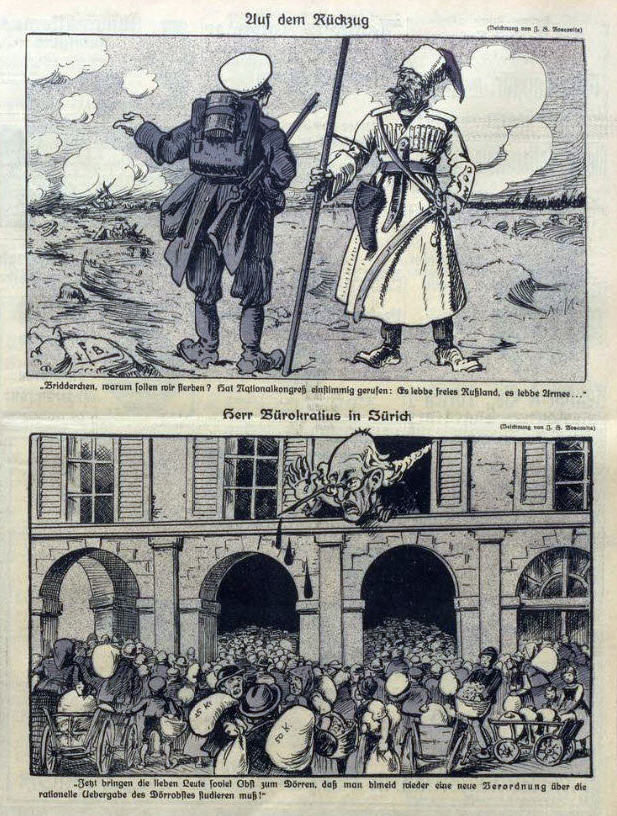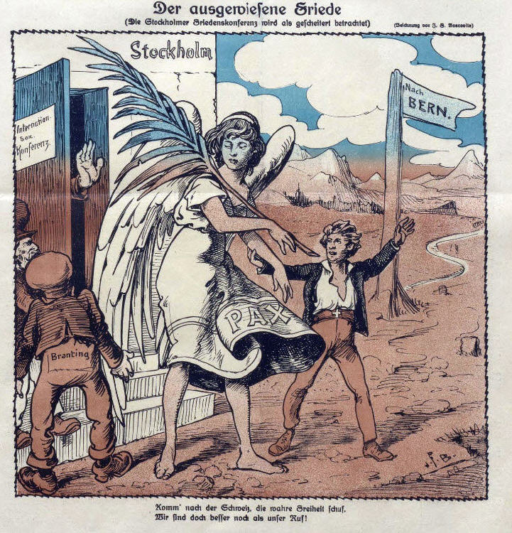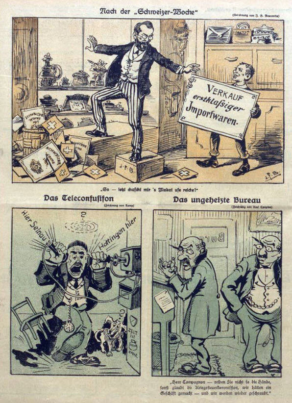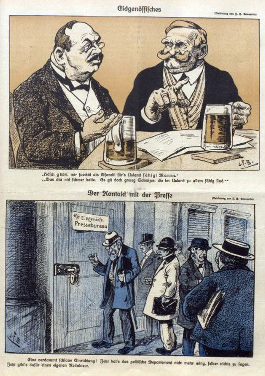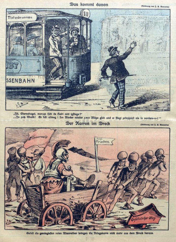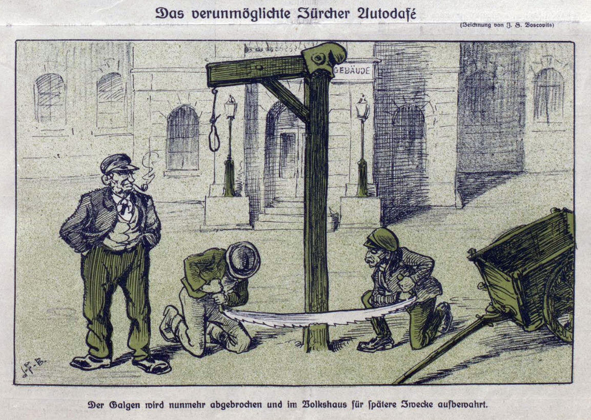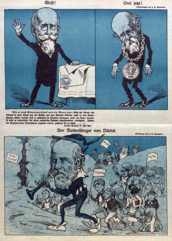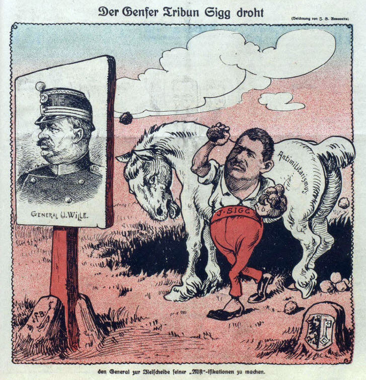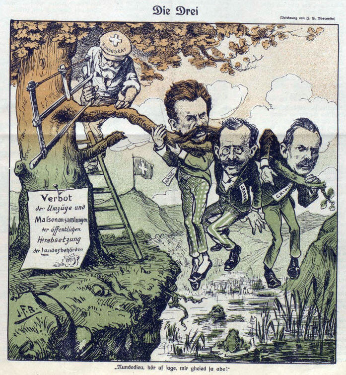 Aus der Galerie berühmter Eidgenossen - Robert Ferdinand Treytorrens de Loys |  Die Drei - Charles Naine, Ernest-Paul Graber und Robert Grimm |  Der Genfer Tribun Sigg droht - Jean Sigg |  Leithammel vor! |