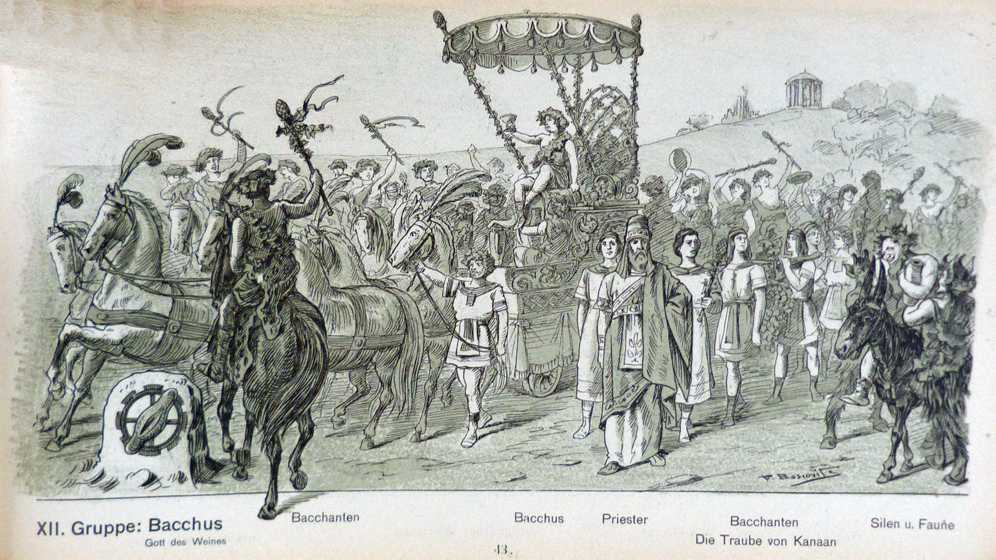 Gruppe Diana: Heimkehr Löwenjagd, Beduinen |  Gruppe Neptun: Neptun, Amphitrite, Matrosen, Nordpolfahrer |  Gruppe Ceres: Triptolemos, Proserpina, Ceres, Hirten |  Gruppe Bacchus: Bacchanten, Bacchus, Priester, Silen und Faune |  Gruppe Bacchus: Weinfabrik, Rodensteiner, Hildebrand | | | |