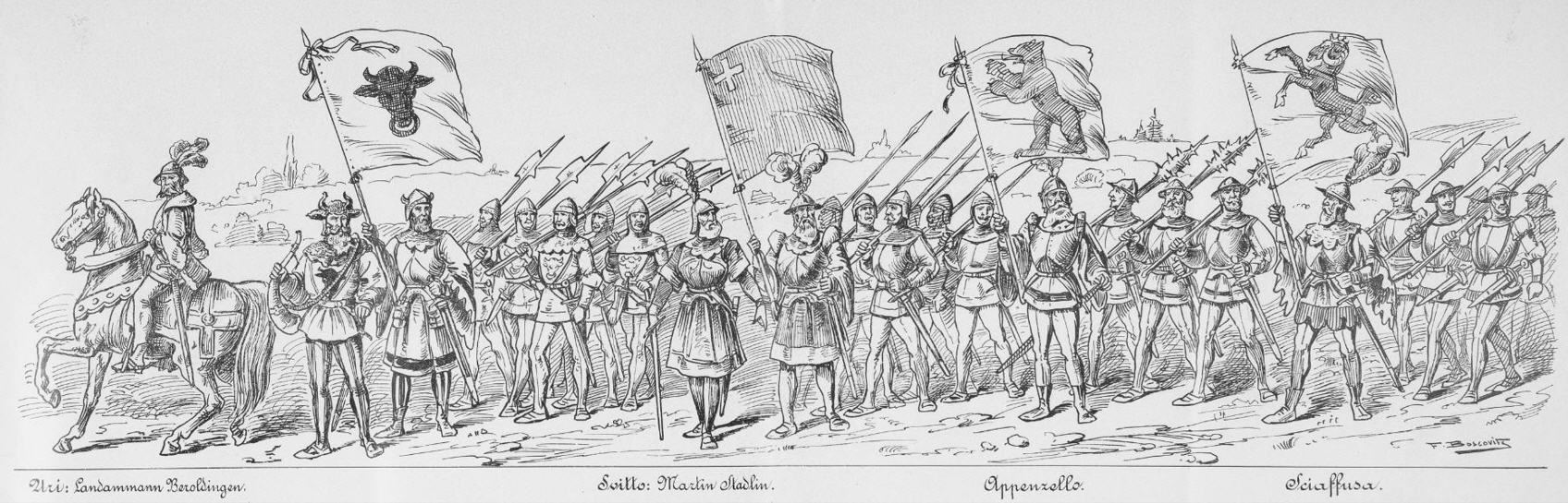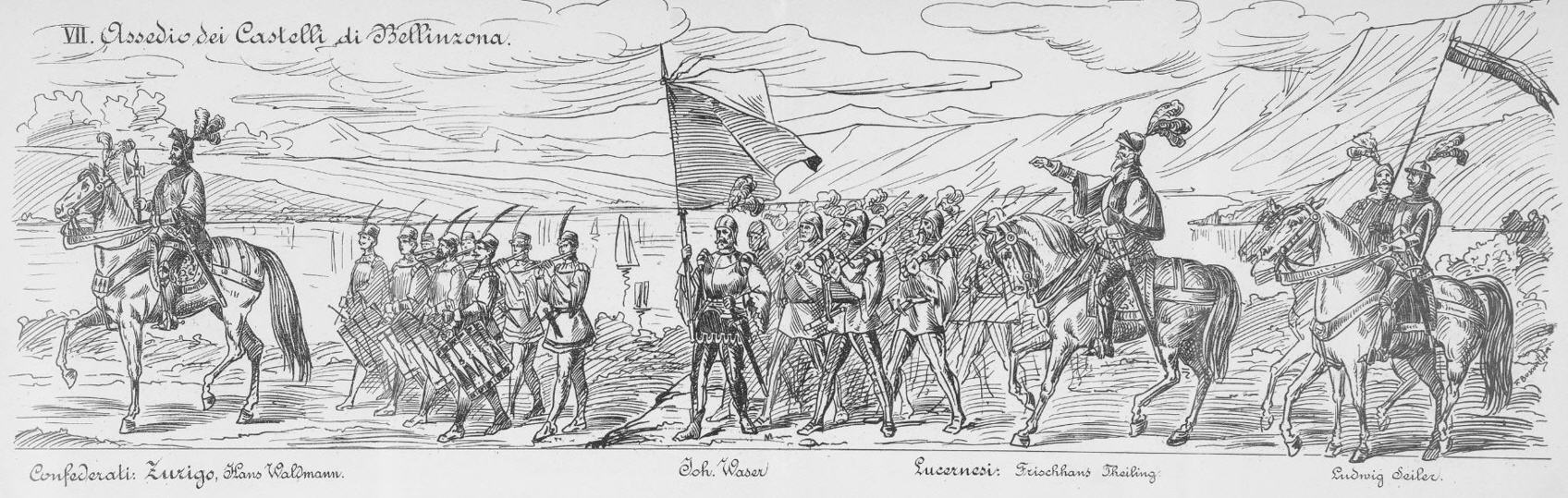 Hans Waldmann, Johann Waser |  Hans Viol, Uli Heiden, Adriano di Bubenberg |  Pietro Paccilard, Conrad Vogt, Enrico Kronauer |  Landammann Beroldingen, Martin Stadlin |  Araldo, Cicco Simonetta |  Wilhelm Tell, Pestalozzi, Stefano Franscini | | |
