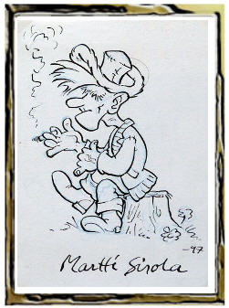 . Der Illustrator, Autor und Cartoonist Martti Sirola ging nach der schulischen Ausbildung an die Universität für Kunst und Design in Helsinki. Anschliessend arbeitete er aus Kunsttherapeut am Hesperia-Krankenhaus, desweiteren arbeitete er in der Kunstthearpie. Er feierte sein Debüt als Comiczeichner mit "Apassit", welches 1974 erschien. Weitere Arbeiten folgten mit "Hölmölän Tales", "Möttönen ja Vehtaaja", "Anakondan arvoitus", "Irvileuka", "Apassit", "Kultainen Kesä", "Livet i Bemböle" und "Jäpänperä". Als Zeichner illustrierte er Bücher von Autoren wie "Ulla-Maija Aaltonen (Hilsu saa jäädä), Kaija Määtä, Raija Oranen und Satu Reinikainen. |
