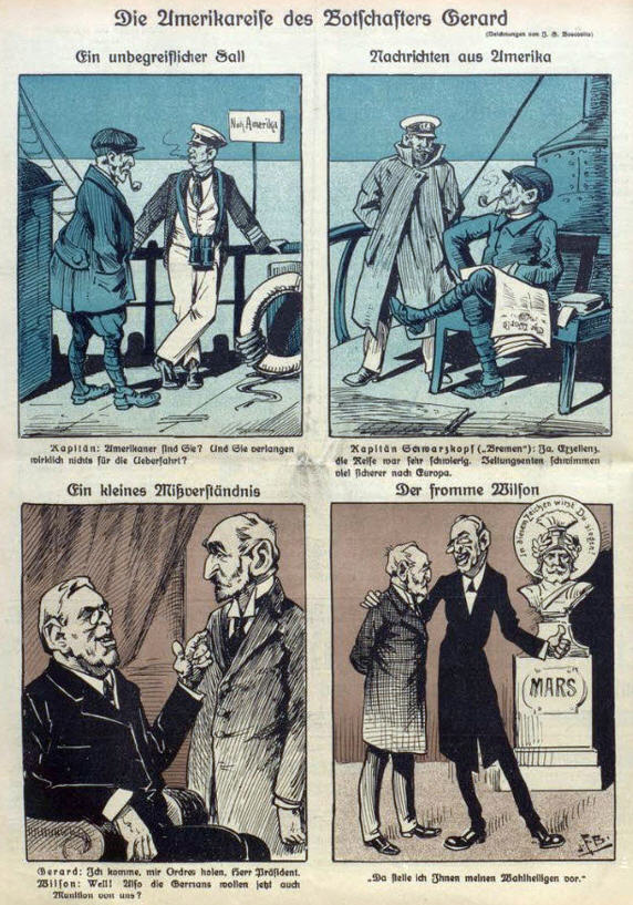 Die Amerikareise des Botschafters Gerard - James W. Gerard und Woodrow Wilson |  Ein Vorschlag zur Güte / Unbegreiflich |  Schöne Seelen finden sich / Vor der Abreise |  Warum der Friede nicht zustande kommt - Kaiser Franz Josef I, Kaiser Wilhlem II und Zar Ferdinand I |