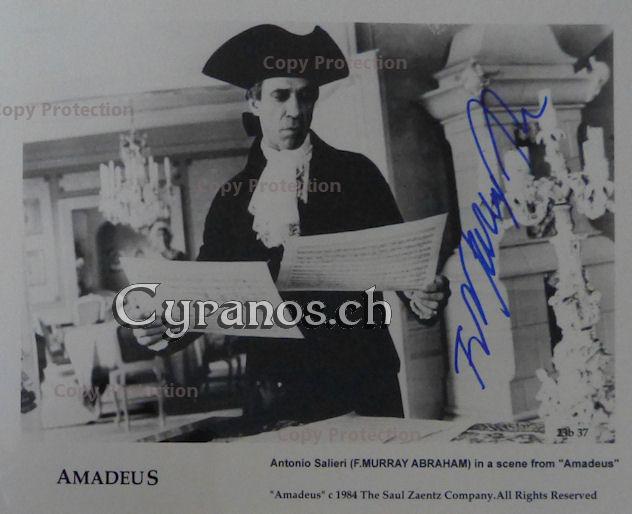 | F. Murray Abraham (1939) The Sunshine Boys 1975, All the President's Men 1976, Scarface 1983, Amadeus 1984, Der Name der Rose 1986, Eye of the Widow 1989, Lodaded Weapon 1993, Mighty Aphrodite 1995, Star Trek: Insurrection 1998 Oscar 1985 Original-signiertes Foto 8x10 inches (Format A4) (C IV) Euro/CHF 39.- Das Autogramm wurde persönlich anlässlich einer Pressekonferenz im Schloss Benrath in Düsseldorf am 25.10.2002 gesammelt The autograph was collected in person at a press conference in Dusseldorf on October 25 2002 | |