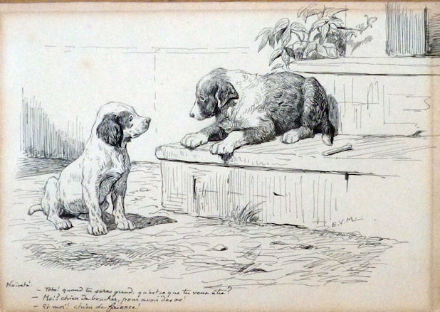 | Irma von Huppmann-Valbella (1888-1978) Die Künstlerin Irma von Huppmann-Valbella wurde als Irma Catherine von Huppmann-Valbella am 17. Dezember 1888 in Brooklyns, Kings, USA geboren. Ihr Vater war Freiherr Josef von Huppmann-Valbella (1851-?) und stammte aus Sankt Petersburg, ihre Mutter Jeanne O'Tard de la Grange (1864-1946) stammte aus New York City. Die Familie bestand aus ihrem Bruder Freiherr James von Huppmann-Valbella (1886-?), ihrer Schwester Freiin Nadine Adeline von Huppmann-Valbella (1892-?) und ihrer Schwester Freiin Vera Isabelle von Huppmann-Valbella (1898-1971). In späteren Jahren zog die Familie in die Schweiz, wo ihre Schwester Nadine 1925 den viel älteren Alexandre Emery (1850-1931) heiratete. Dieser war ein einflussreicher Hotelier und Politiker, unter anderem gehörte er von 1906 bis 1917 dem Nationalrat an. Irma von Huppmann-Valbella studierte ab 1922 an der Akademie der Bildenden Künste in München im Fach Malerei. Schön früh zeigte sich ihre Vorliebe für Studien zu Tieren, speziell zu Hunden. Eine Leidenschaft, die sie bis ins hohe Alter verfolgte. So erschien bereits 1925 in einer deutschen Zeitschrift anlässlich der Rassehunde-Ausstellung in Augsburg eine Zeichnung von ihr, die mehrere Hunderassen zeigte. In den kommenden Jahren entstanden zahlreiche weitere Tierstudien sowie -skizzen, die auch beim Publikum Gefallen fanden. An Ausstellungen zeigte sie ihre Arbeiten, so 1943 an der Ausstellung der Sektion Lausanne der Schweizerischen Malerinnen, Bildhauerinnen und Dekorateurinnen und 1944 im Musée Arlaud in Lausanne, wo nebst ihren Tiermotiven auch ein karikaturistisches Porträt eines Apothekers und die fünf Elefanten im Zirkus Knie Anklang fanden sowie von ihr erschaffene Steingutgläser präsentiert wurden. Im gleichen Jahr waren Arbeiten von ihr an der Gemäldeausstellung vom Komitee „Arts et Lettres“ der Entwicklungsgesellschaft von Montreux zu sehen. Noch 1977 kurz vor ihrem Tod wurden Arbeiten von ihr mit Schwerpunkt „Hundestudien“ in der Galerie „Arts et Bijoux“ in Montreux ausgestellt, zusammen mit den Künstlern Walter Würgler, Trudy Schlatter und Elisabeth Müller. Neben ihren Zeichnungen realisierte sie auch Gemälde und Aquarelle, darunter auch Porträts und wenige Selbstporträts. Irma von Huppmann-Valbella verstarb am 9. Januar 1978 in Montreux. Oben: Original-Zeichnung monogrammiert (Format 17.5 x 29 cm, Beschädigungen an den Ecken - siehe Scan) Euro/CHF 15.- Mitte: Original-Zeichnung (Format 32.5 x 44.5 cm) Euro/CHF 17.- Unten: Original-Zeichnung (Format 23 x 29 cm) Euro/CHF 17.- oder im Tausch gegen eine Original-Zeichnung eines anderen Karikaturisten/Illustratoren. | |