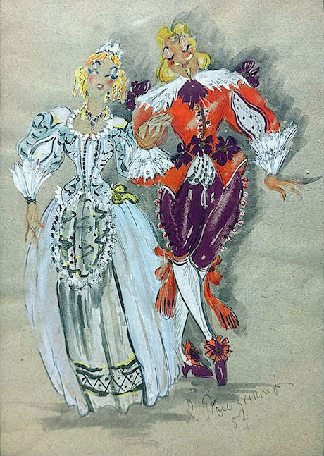| H. O. (?-?) Bühnenbildner Original-Zeichnung Kostümentwurf von 1961, signiert mit H. O. Wer kann Angaben zum Namen des Bühnenbildners machen? (Format 37 x 50 cm) Euro/CHF 50.- oder im Tausch gegen eine Original-Zeichnung eines anderen Karikaturisten/Illustratoren/Comic-Zeichner. | |