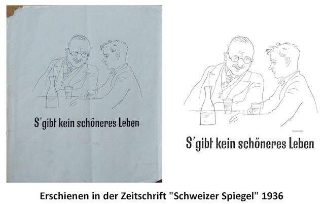 | Marcel Vidoudez (1900-1968) Illustrator Oben: Original-Zeichnung monogrammiert (Format 12.5x14.5 cm) für die Zeitschrift "Schweizer Spiegel" Mai 1929 Euro/CHF 49.- Unten: Original-Zeichnung (Format A4) für die Zeitschrift "Schweizer Spiegel" November 1940 Euro/CHF 49.- oder im Tausch gegen eine Original-Zeichnung eines anderen Karikaturisten/Illustratoren/Comic-Zeichner. | |