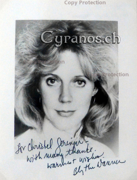 | Blythe Danner (1943) To Kill a Clown 1972, MASH 1976, Futureworld 1976, Der grosse Santini 1980, Eine andere Frau 1988, Alice 1990, Mr. & Mrs. Bridge 1990, Das Gift des Zweifels 1992, Mad City 1997, Meine Braut, ihr Vater und ich 2000 Original-signiertes Foto 3.5x5.5 inches (Postkartenformat) (D III) Euro/CHF 17.- | |