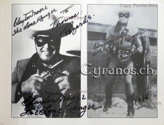 | Clayton Moore (1914-1999) Unter falschem Namen 1937, Sergeant Madden 1939, Die Stunde der Vergeltung 1940, Männer mit eisernen Nerven 1949, Zorro im Wilden Westen 1949, Gier nach Gold 1952, Kansas Pazifik 1953, Der weisse Reiter 1956, Lassie 1959 Original-signiertes Foto 5x7 inches (Format A5) (D I) Euro/CHF 35.- | |