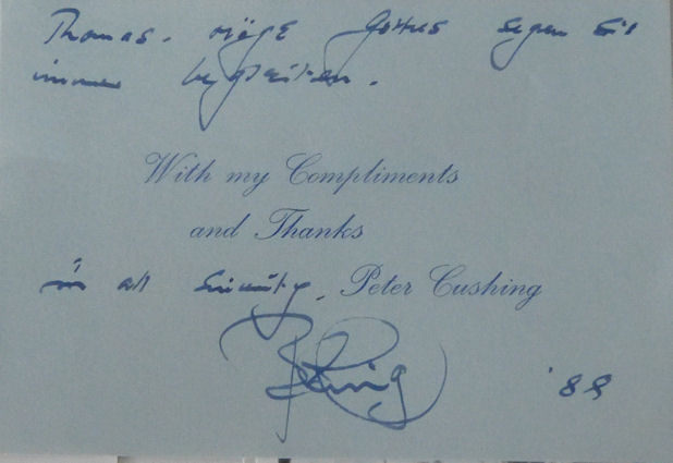 | Peter Cushing (1913-1994) Der Mann mit der eisernen Maske 1939, Laurel & Hardy in Oxford 1940, Hamlet 1948, Moulin Rouge 1952, Alexander der Grosse 1956, Dracula 1958, Herrscherin der Wüste 1965, Der Fluch der Mumie 1967, Asylum 1972, Krieg der Sterne 1977, Die Standarte 1977, Son of Hitler 1978, Top Secret 1984 Original-signiertes Blatt 3.5x5.5 inches (Postkartenformat) (D III) Euro/CHF 49.- | |