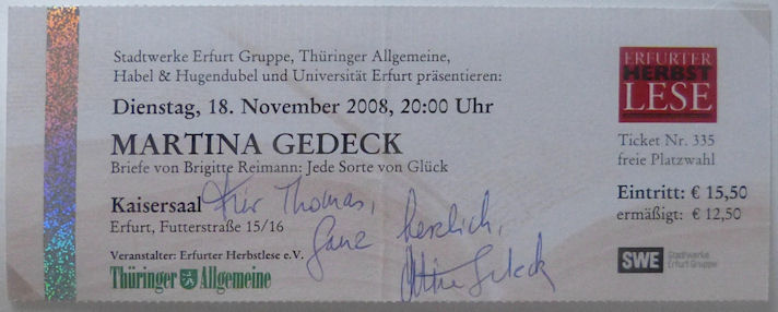 | Martina Gedeck (1961) Der doppelte Nötzli 1990, Krücke 1993, Der bewegte Mann 1994, Rossini 1997, Elementarteilchen 2006, Der Baader Meinhof Komplex 2008, Die Wand 2012, Nachtzug nach Lissabon 2013, Das Tagebuch der Anne Frank 2016 Original-signierte Karte 3.5x5.5 inches (ca. Postkartenformat) Euro/CHF 4.- Das Autogramm wurde persönlich in Erfurt 2008 gesammelt. | |