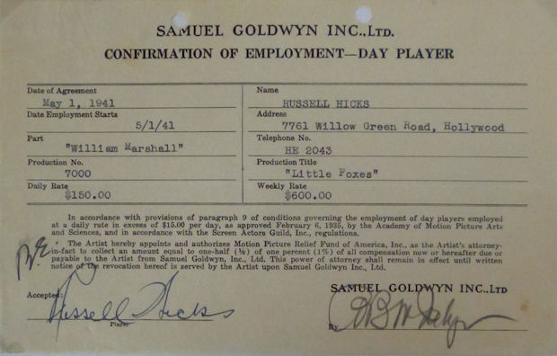 | Russell Hicks (1895-1957) The Birth of a Nation 1915, Intolerance 1916, The St. Louis Kid 1934, Babbitt 1934, Charlie Chan in Shanghai 1935, Pick a Star 1937, In Old Chicago 1938, Union Pacific 1939, Laurel und Hardy: Schrecken der Kompanie 1941, Sergeant York 1941, The Little Foxes 1941, The Flying Saucer 1950 Original-signierter Vertrag "Bestätigung als Tagesdarsteller" von 1941 5x7 inches (Postkartenformat) (C I) Euro/CHF 69.- | |